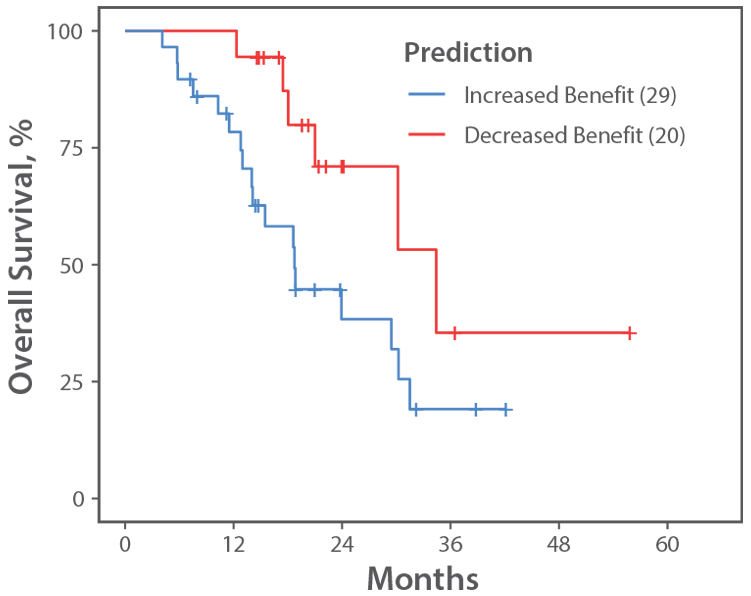 Comprised of 5,000 machine learning algorithms, Caris FOLFIRSTai identifies the treatment which offers the best benefit as a first-line option for each patient based on the patient’s molecular profile. During validation with two independent data sets (real-world evidence and Phase III TRIBE2 study data), Caris FOLFIRSTai demonstrated that the overall survival (OS) of patients treated in a manner consistent with the FOLFIRSTai prediction was 17.5 months longer (71%) than the OS of patients treated counter to the prediction.1