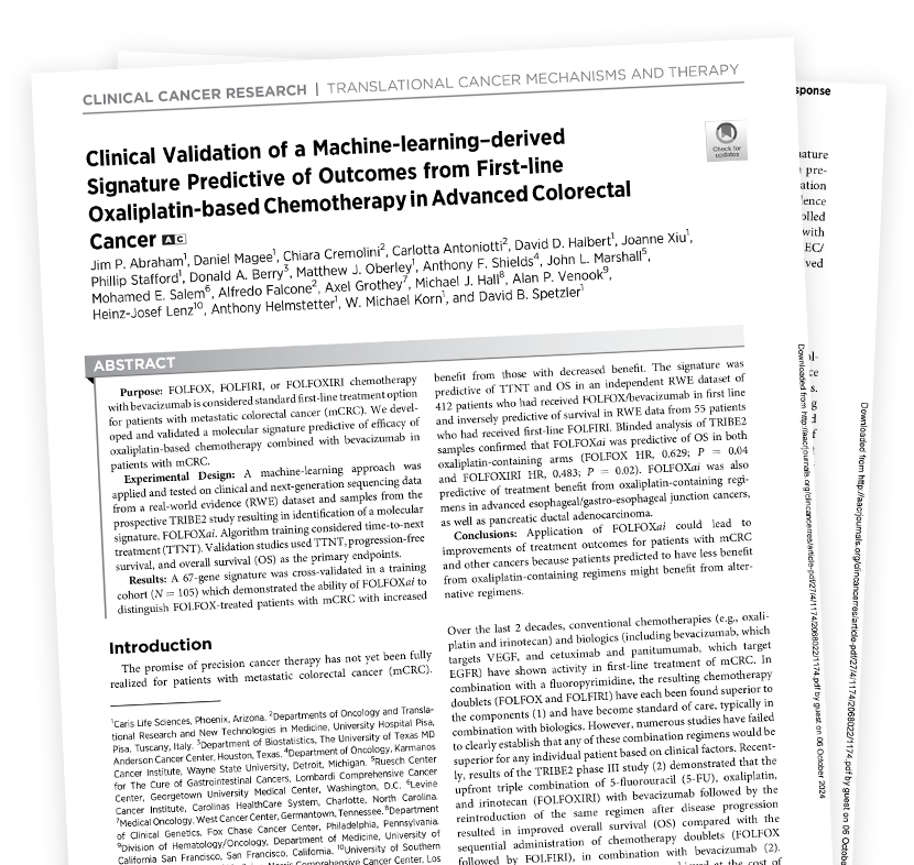 Caris FOLFIRSTai® is the first clinically validated, AI-powered molecular predictor of chemotherapy efficacy for mCRC patients, and is included for Caris molecular profiling mCRC cases at no additional cost, increased turnaround time or added specimen requirements.